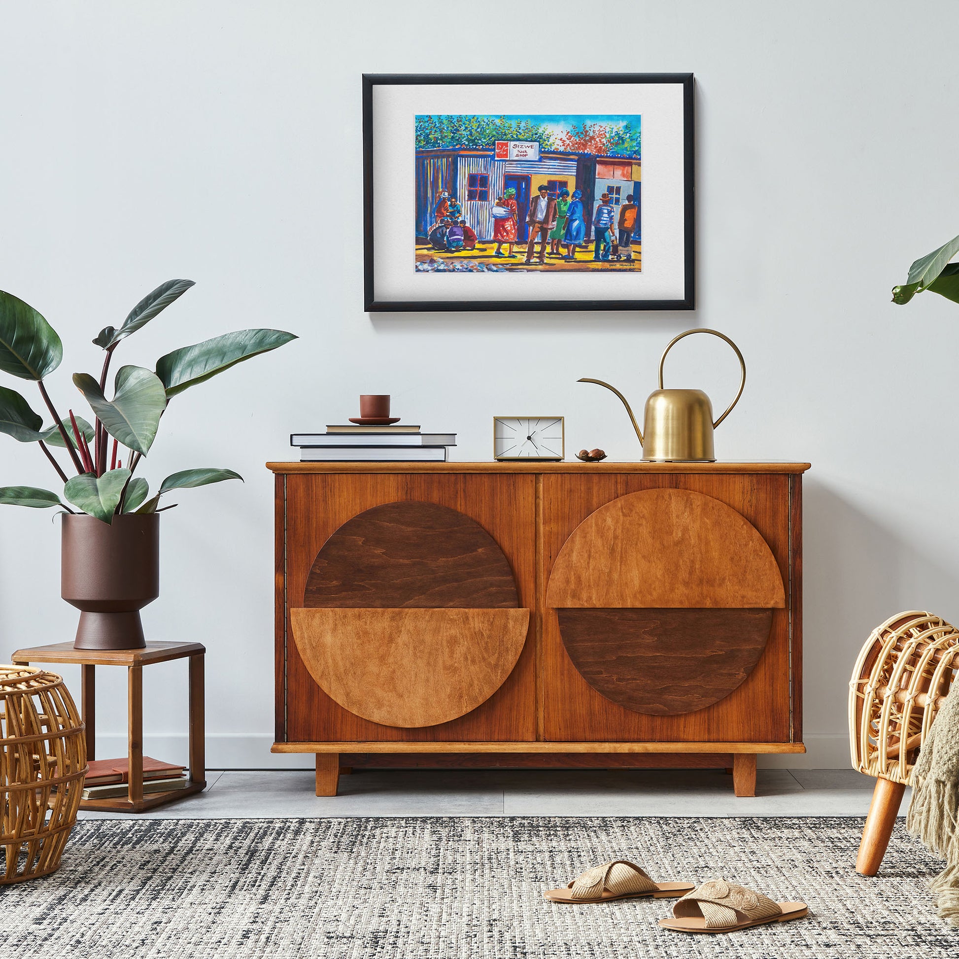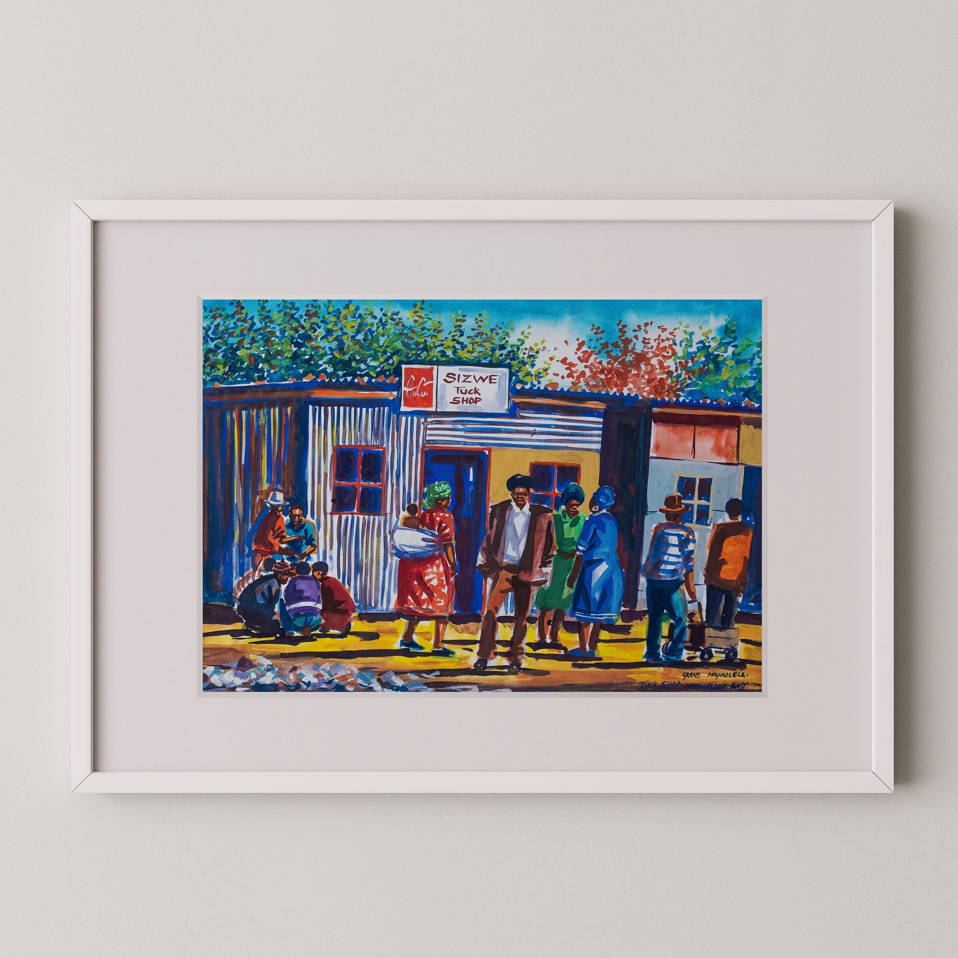 Alive with warmth and colour, Sizwe Tuck Shop celebrates everyday life in a South African township. Grand Maghandlela captures a slice of community spirit—neighbours chatting, children playing, and families gathered outside the corrugated iron walls of a local spaza shop. These informal shops have long been pillars of township life, offering not just goods but connection, conversation, and support.